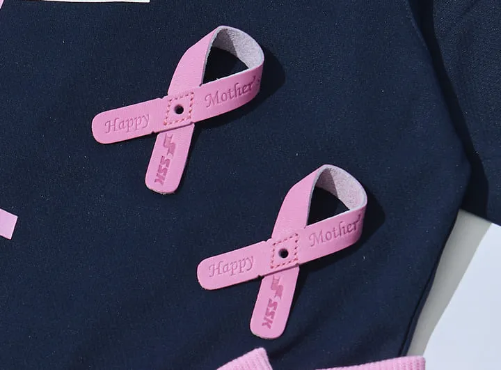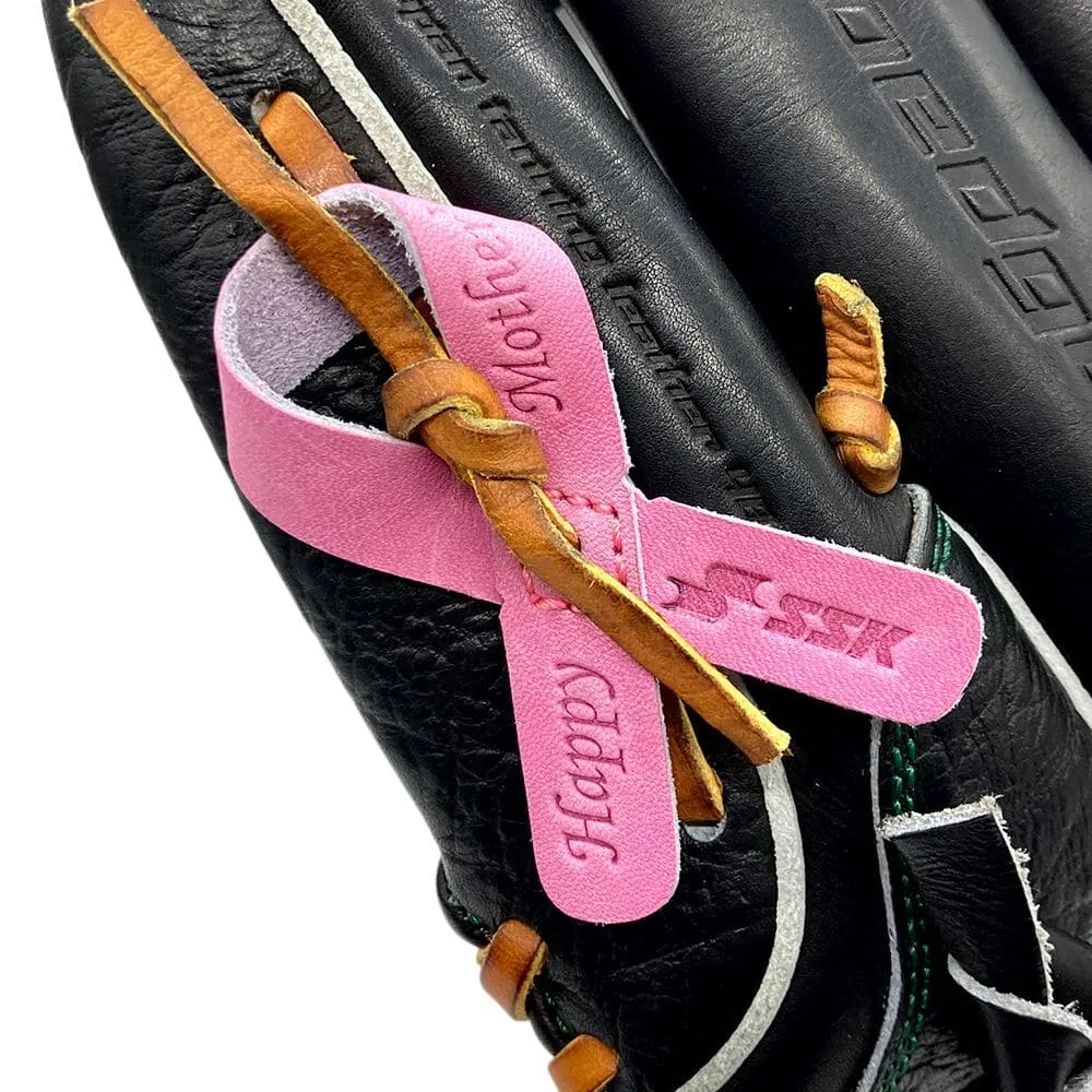 グラブの締め紐に装着する母の日仕様のグラブレザーアクセサリー。昨年の母の日に行われたプロ野球の試合では、SSKアドバイザリースタッフの選手たちもグラブに装着しました。